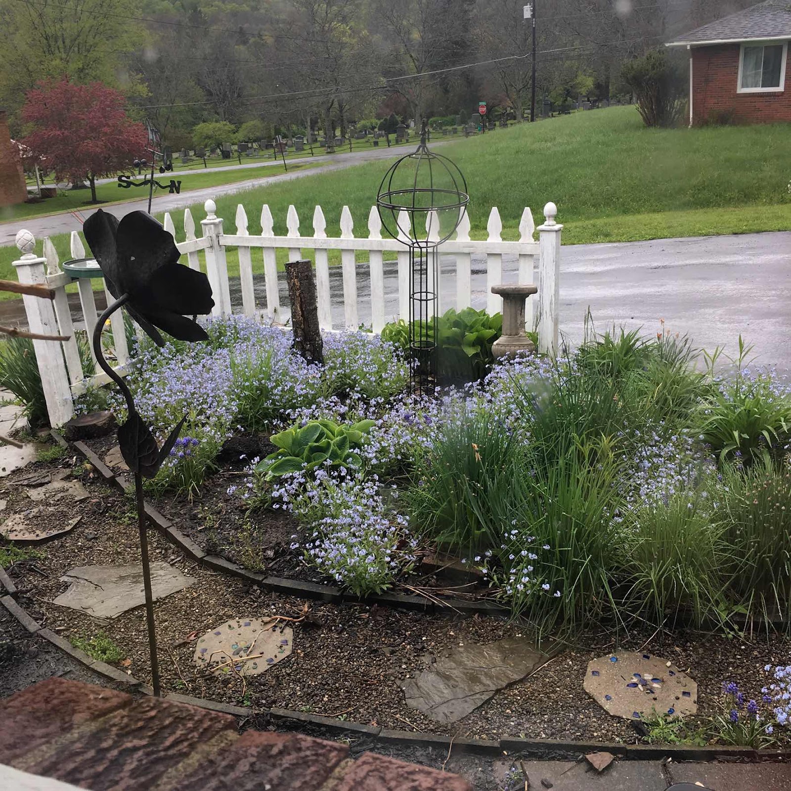 Isn’t the picket fence area just beautiful this Spring? Those lovely blue flowers are all volunteers. I’m not sure what they are but they have spread all around that area. I am planning on doing something else with this space in the summer but right now I wouldn’t touch it.