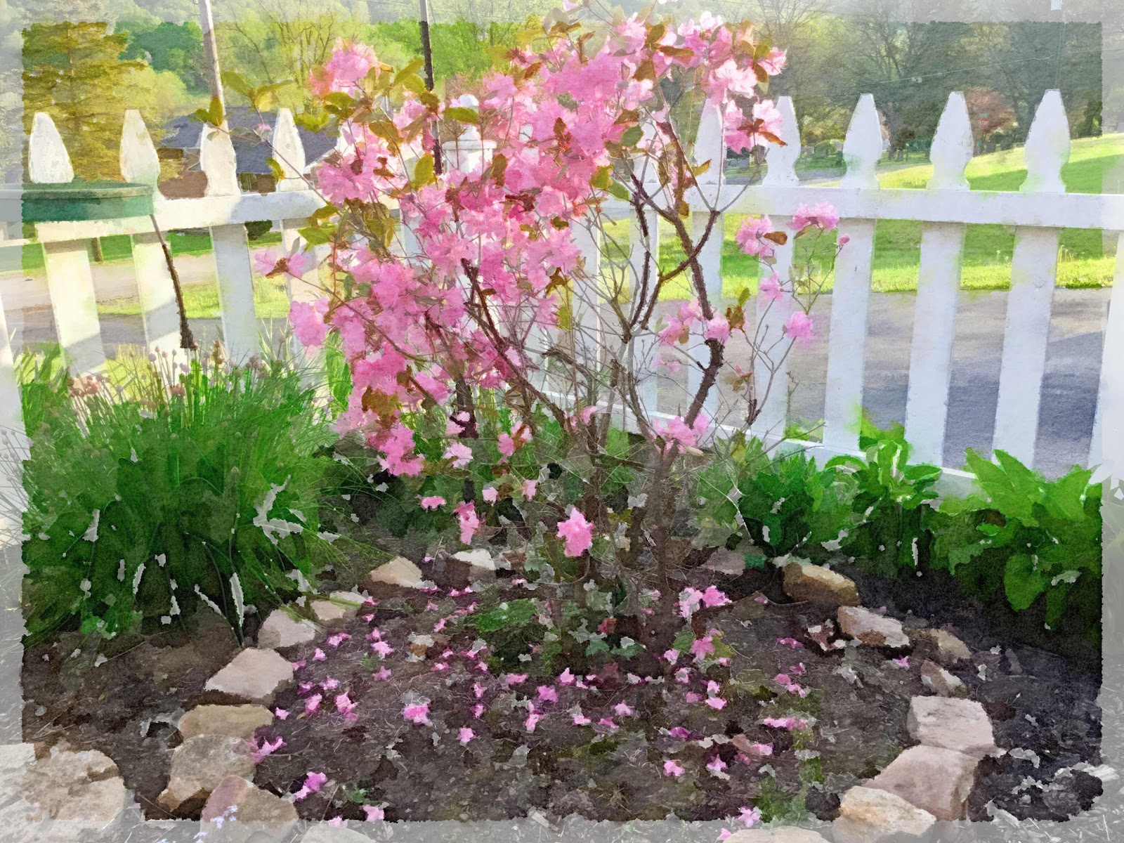 The azalea that was transplanted from the other side of the house last year is in full bloom. Even though summer has begun in most parts of the country here in my town we are having spring. The leaves are just coming out on the trees now and the hills are gloriously green. Some perennials are growing in the flower gardens and the chives are starting to flower.
